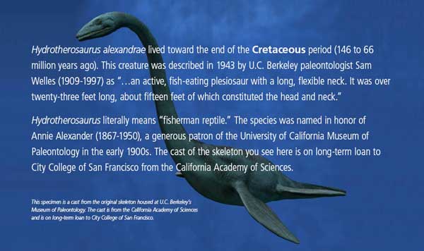 Hydrotherosaurus literally means “fisherman reptile.” The species was named in honor of Annie Alexander (1867-1950), a generous patron of the University of California Museum of Paleontology in the early 1900s. The cast of the skeleton you see here is on long-term loan to City College of San Francisco from the California Academy of Sciences.
