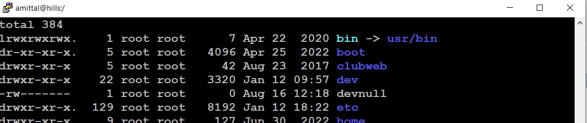 If we do a ls on the "/" on the hills server we get the following folders: [amittal@hills /]$ ls bin dev home logs ops pub run students users boot devnull lib media opt restore sbin sys usr clubweb etc lib64 mnt proc root srv tmp var