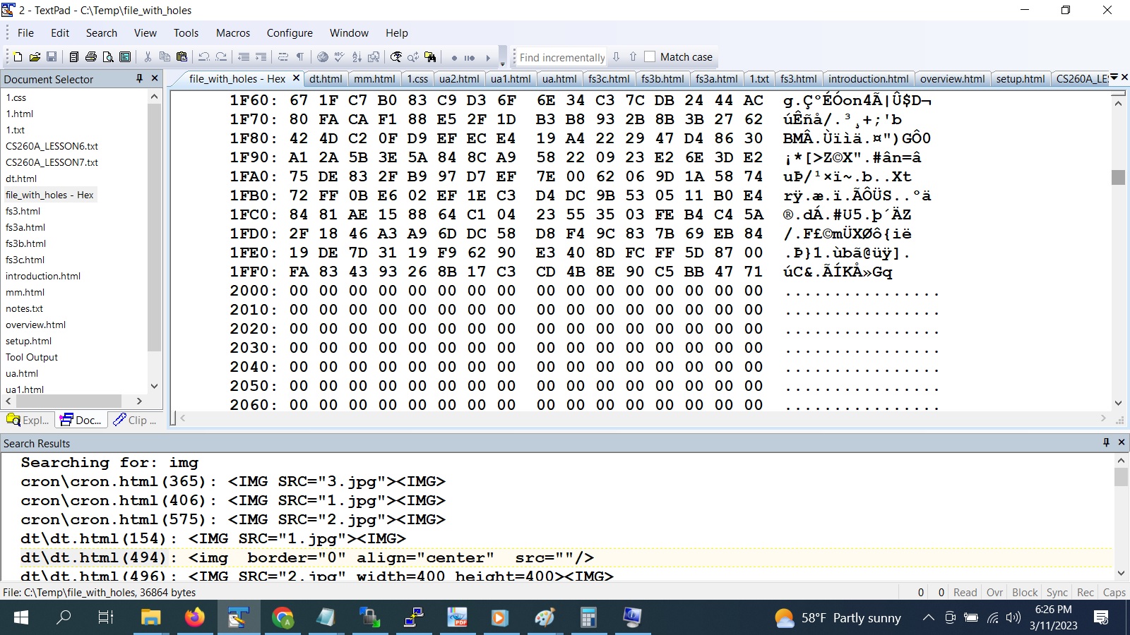 We can use a file for a swap space. It must not have any "holes". It's possible that some data is written at an offset to the size of the file and this produces a hole in the file which is filled up all zeroes. Many modern filesystem will not actually write these zeroes on the disk but rather keep this information in the inode structure. The result is that the actual size of file on the hard disk is much smaller. The concept of a hole in a file may be better understood with an example. The "dd" command ( disk/data duplicator) is used to copy raw data from one source to another.[amittal@hills temp]$ dd if=/dev/urandom bs=4096 count=2 of=file_with_holes 2+0 records in 2+0 records out 8192 bytes (8.2 kB, 8.0 KiB) copied, 0.000273703 s, 29.9 MB/s [amittal@hills temp]$ ls -l file_with_holes -rw------- 1 amittal csdept 8192 Mar 11 18:13 file_with_holes [amittal@hills temp]$ dd if=/dev/urandom bs=4096 seek=7 count=2 of=file_with_holes 2+0 records in 2+0 records out 8192 bytes (8.2 kB, 8.0 KiB) copied, 0.000235385 s, 34.8 MB/s [amittal@hills temp]$ ls -l file_with_holes -rw------- 1 amittal csdept 36864 Mar 11 18:13 file_with_holes [amittal@hills temp]$We first create a file with 2 blocks of size 4096 in the first "dd" command. The "if" option reads from the random file so we get random data and the output file is "file_with_holes". We run another "dd" command but we start writing at 7th block of 4096 and we write 2 blocks. So we have written ( 4096*4) byest and skipped ( 7-3 = 4 blocks ), the same amount. So our file size is roughly 36Kb. We can transfer this file to our windows system and open it with Textpad in binary format.