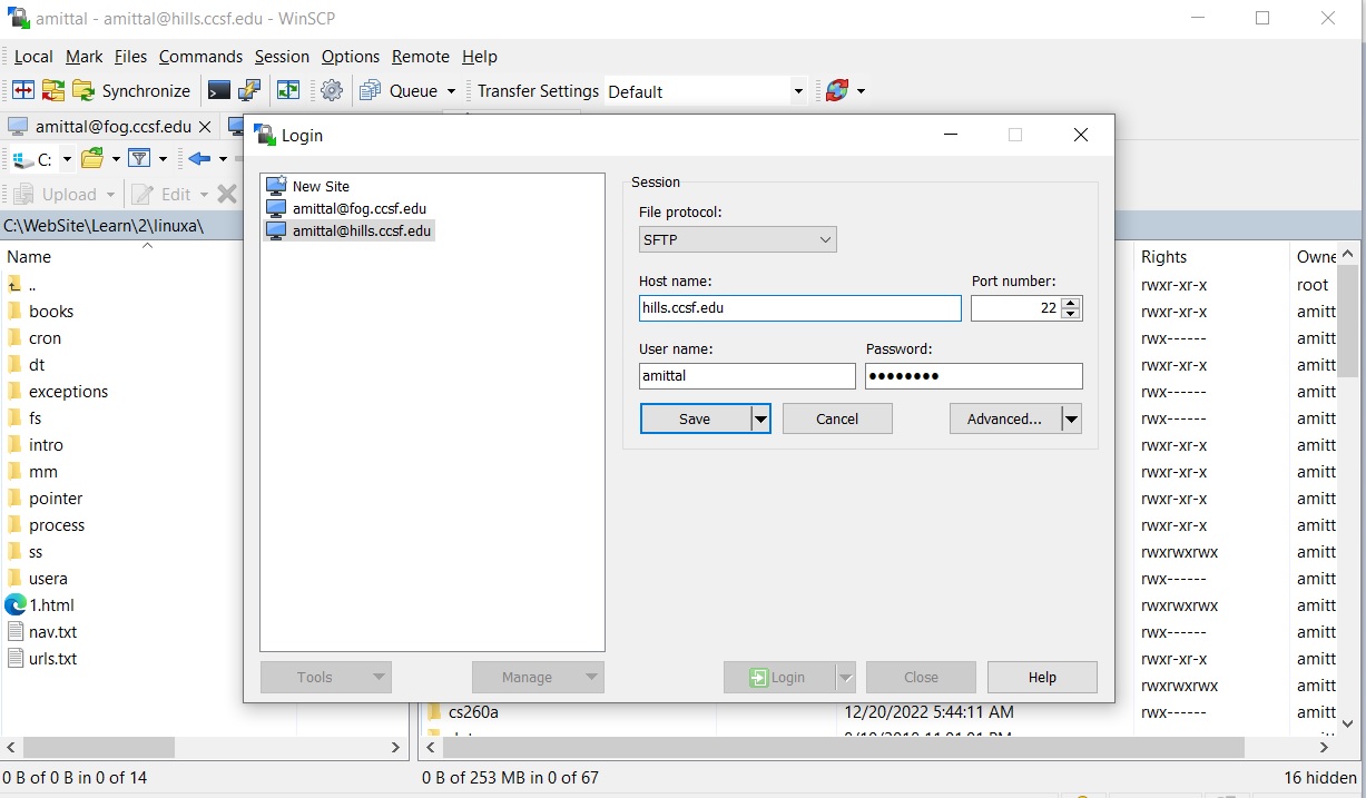 The putty download is a single file. I placed it in the "C:\Putty" folder. Upon opening WinSCP we can create a new session. Fill in the entries as below. Save the setting and try connecting to the hills server. Of course the User name and password will be yours.