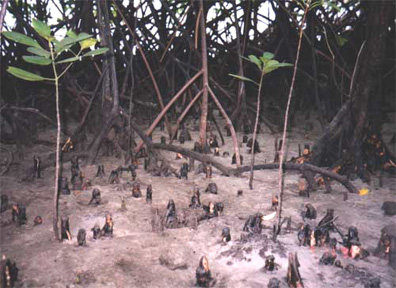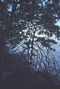 Prop roots supporting mangroves and pneumatophores to aid in