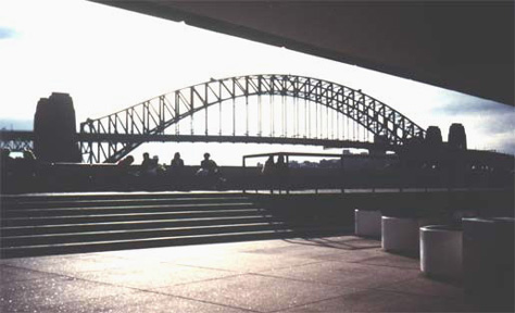 Sydney Harbour Bridge framed by the concourse of the Opera