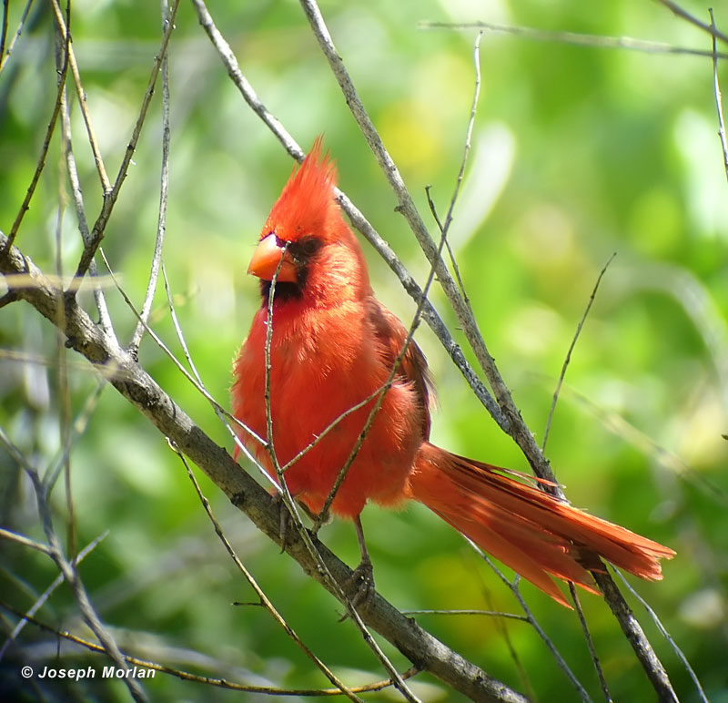 ![]() This species is a widespread resident throughout North America south to Mexico. This is a male. Females are much duller. It has expanded its range northward since the 19th century taking advantage of bird feeders. It goes by a number of local vernacular names; perhaps the most common being "Redbird." It was formerly placed in the genus "Richmondena." Eighteen subspecies have been described. C. c. superbus is restricted to Arizona and adjacent areas. It is much larger and has less black across the forehead compared to birds in the Eastern United States, seven of which have named it their "State Bird." Contrary to "Birds of North America" the race introduced and barely surviving in Los Angeles is not superbus, but nominate cardinalis from the East. Digiscoped with Panasonic DMC-LZ5 | Nikon FieldScope III | 30XWA | hand-held (no adapter) |