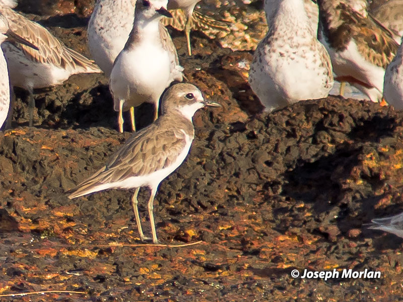 ![]() ![]() Gavin O'Brien was very helpful in sorting out the Greater and Lesser Sand-Plovers. Lessers have a consistently thinner, more delicate bill and shorter legs. In the top photo, the Lesser Sand-Plover is in front of a Greater Sand-Plover. This species usually arrives in August although a few may stay through the Austral winter. Five subspecies are recognized. Clements and IOC attribute birds wintering in Australia to either nominate C. m. mongolus or C. m. stegmanni. The two are not easily separable in the field. Stegmanni average shorter legged, longer winged and more stubby billed. This bird shows characters consistent with nominate mongolus. English spelling varies. Clements changed from "Sandplover" to "Sand-Plover" following the AOU in 2009. The BOU and IOC consistently spell it "Sand Plover" (no hyphen) but in July 2014, Birdlife International switched from "Sand Plover" to "Sandplover" following HBW. "The nice thing about standards is that you have so many to choose from." -- Andrew S. Tanenbaum (1981). Background: Great Knots, Greater Sandplover, Ruddy Turnstone. Digiscoped with Panasonic DMC-LZ5 | Nikon FieldScope III | 30XWA | hand-held (no adapter) |