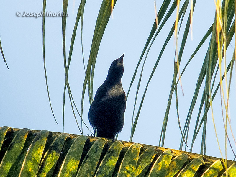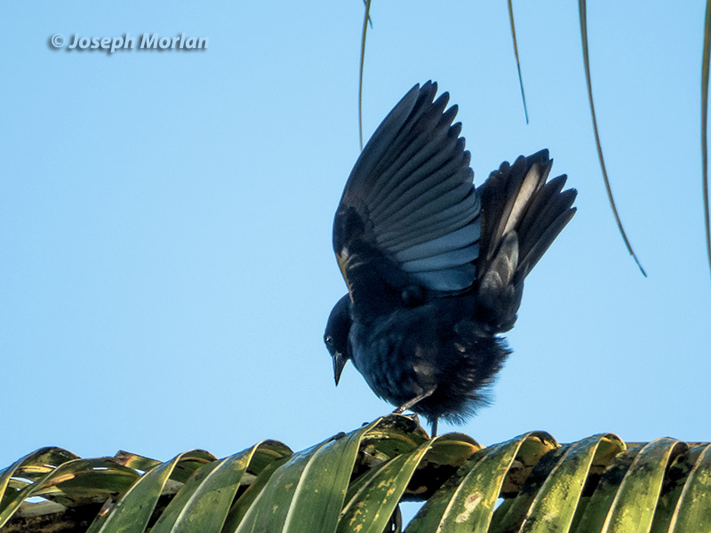 ![]() ![]() ![]() Displaying male (perched in palm) holds wings upward and cocks tail vertically. This close relative of the familiar Red-winged Blackbird is common and widespread in Cuba. It also occurs in part of W. Haiti. Unlike the Red-winged Blackbird, females look the same as males. This species has occurred at Key West (1936 specimens) but more recent sight records from the Florida Keys have been questioned (ABA Checklist 7th ed). Two subspecies are recognized. This is the nominate race found on the main island of Cuba. A smaller race has been described from Cayo Cantiles. Reference: Jaramillo, A., & Burke, P. (1999). New World Blackbirds: The Icterids. Princeton, N.J: Princeton University Press. Canon SX50 HS (top and middle) Digiscoped with Panasonic LX5 (bottom) |