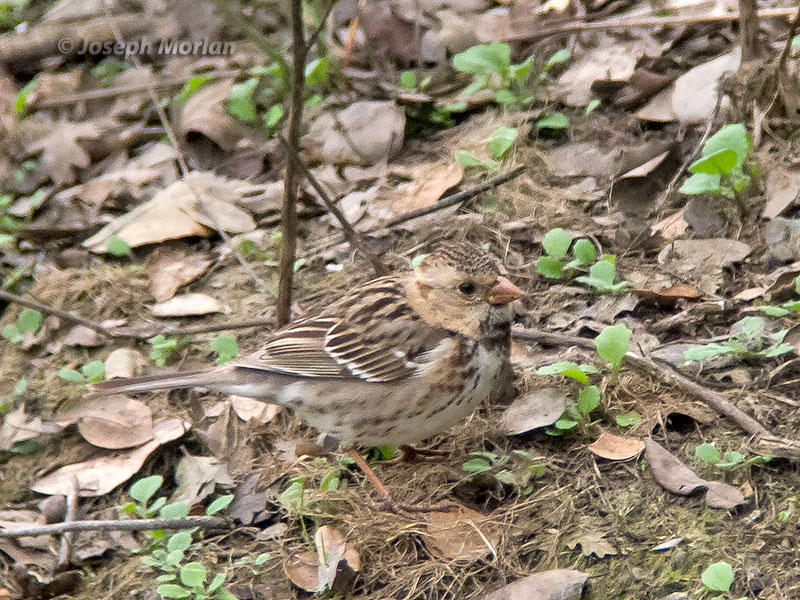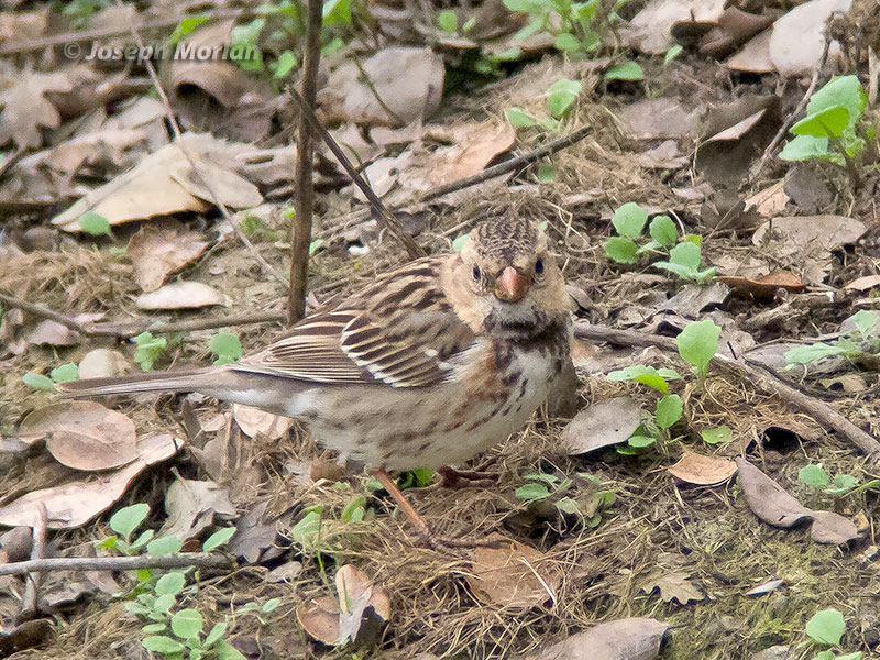 ![]() ![]() This local rarity was first reported 24 December 2016. This is arguably, the largest sparrow in North America. It is also one of most poorly known. It breeds in remote regions of Canada and its nest was not described until 1932 when the species was found breeding near Churchill, Manitoba. It winters mostly in the southern plains, but vagrants may show up almost anywhere in North America. It is named in honor of Edward Harris, a patron of J. J. Audubon. This is an immature lacking the adult's black chin and throat. Males and females are similar, although males are larger and may have a more extensive black bib. Winter and breeding plumages are similar, except that winter birds have the face washed with buff instead of the white color of breeding. Panasonic DMC-LX5 / Nikon FS 3 / 30XWA / hand-held, no adapter. |