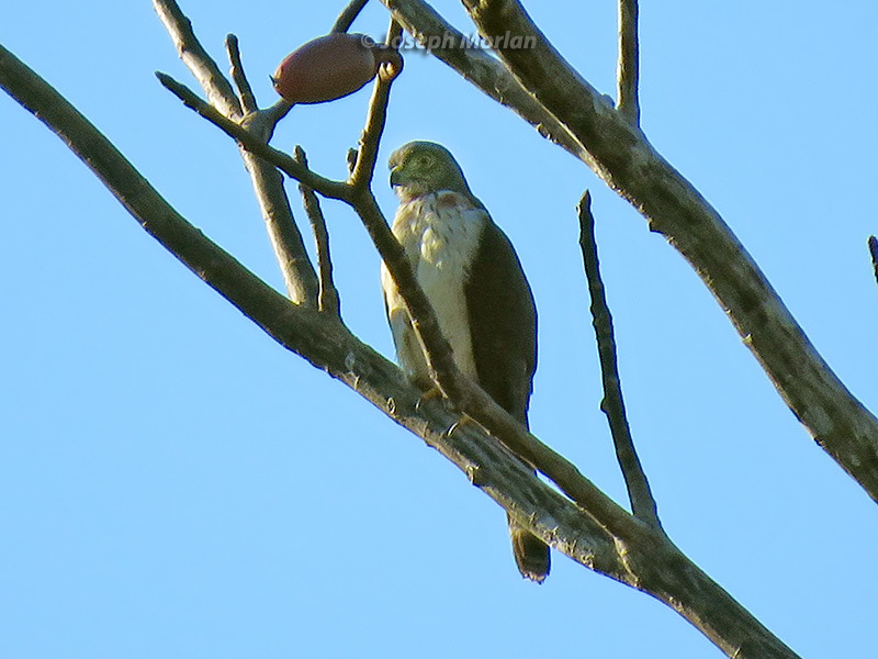![]() ![]() ![]() ![]() Slightly fluffed up from preening, this photo shows the distinct line down the middle of the throat which helps distinguish this species. Juveniles such as this are white below with variable amounts of dusky streaking. This is a variant in which its underparts are almost unmarked. Adults have variable amounts of rust color on their underparts. This is a rather rare species and we only saw it once on our visit to the Amazon. They reportedly follow troops of monkeys to capture small lizards and insects disturbed in the forest canopy. A distinctive double notches on the cutting edge of the maxilla gives the Double-toothed Kite its name. Two subspecies are recognized of which this is the nominate race found in tropical South America. Canon PowerShot SX60 HS. References: Bierregaard, R.O., Jr, Marks, J.S. & Kirwan, G.M. (2019). Double-toothed Kite (Harpagus bidentatus). In: del Hoyo, J., Elliott, A., Sargatal, J., Christie, D.A. & de Juana, E. (eds.). Handbook of the Birds of the World Alive. Lynx Edicions, Barcelona. (retrieved from https://www.hbw.com/node/52973 on 31 July 2019) Double-toothed Kite (Harpagus bidentatus), In Neotropical Birds Online (T. S. Schulenberg, Editor). Cornell Lab of Ornithology, Ithaca, NY, USA. retrieved from Neotropical Birds Online: https://neotropical.birds.cornell.edu/Species-Account/nb/species/dotkit1 Global Raptor Information Network. 2019. Species account: Double-toothed Kite Harpagus bidentatus. Downloaded from http://www.globalraptors.org on 30 Jul. 2019 |