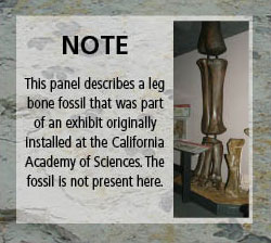 This panel describes a leg bone fossil that was part of an exhibit originally installed at the California Academy of Sciences. The fossil is not present here.